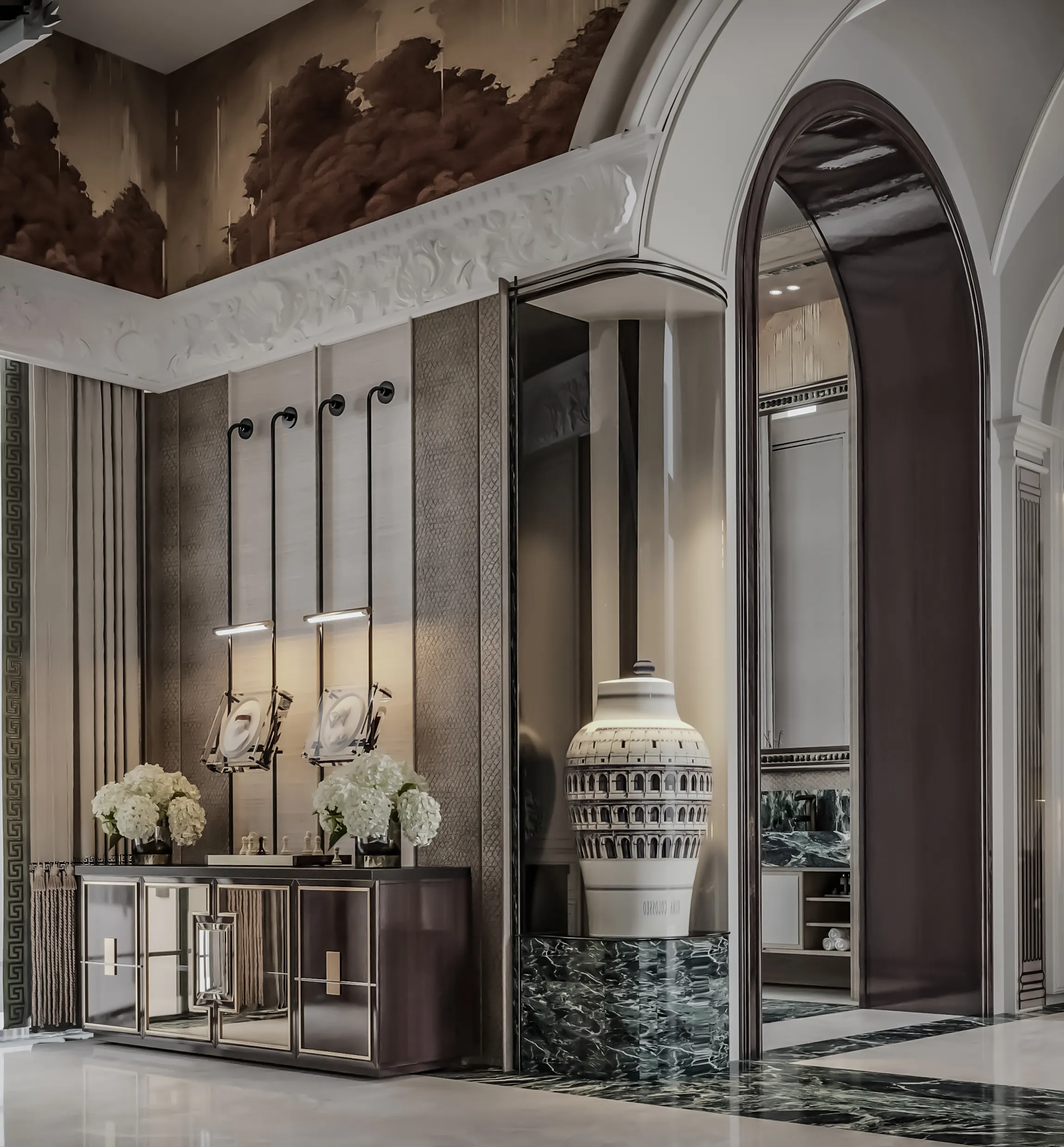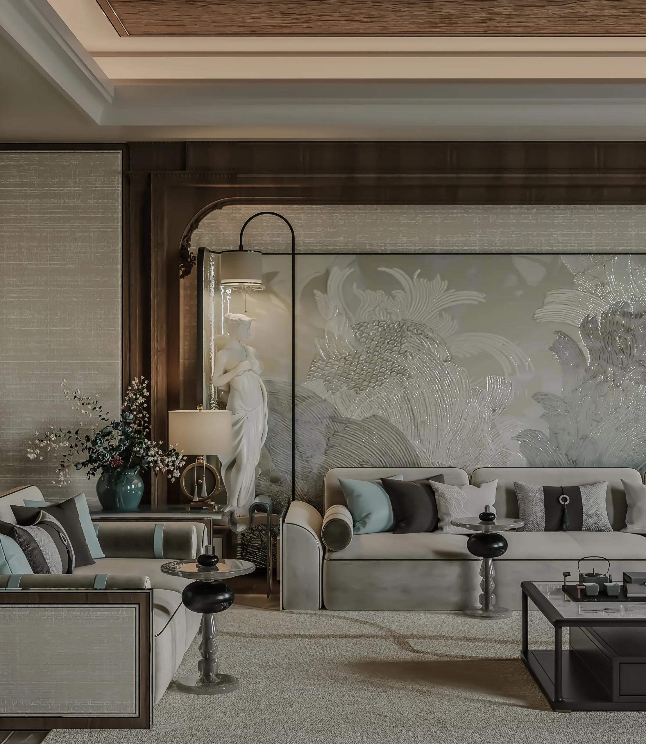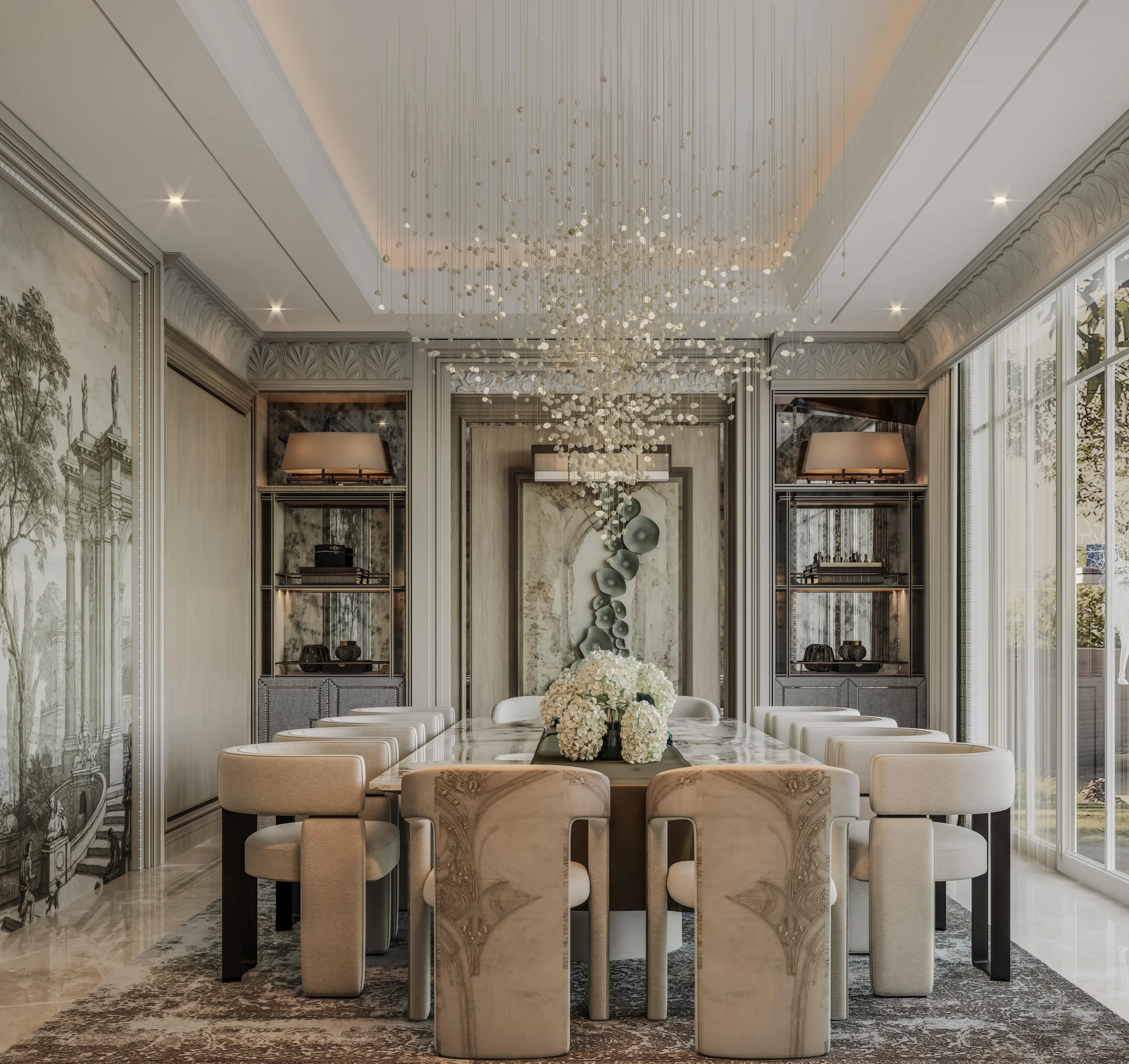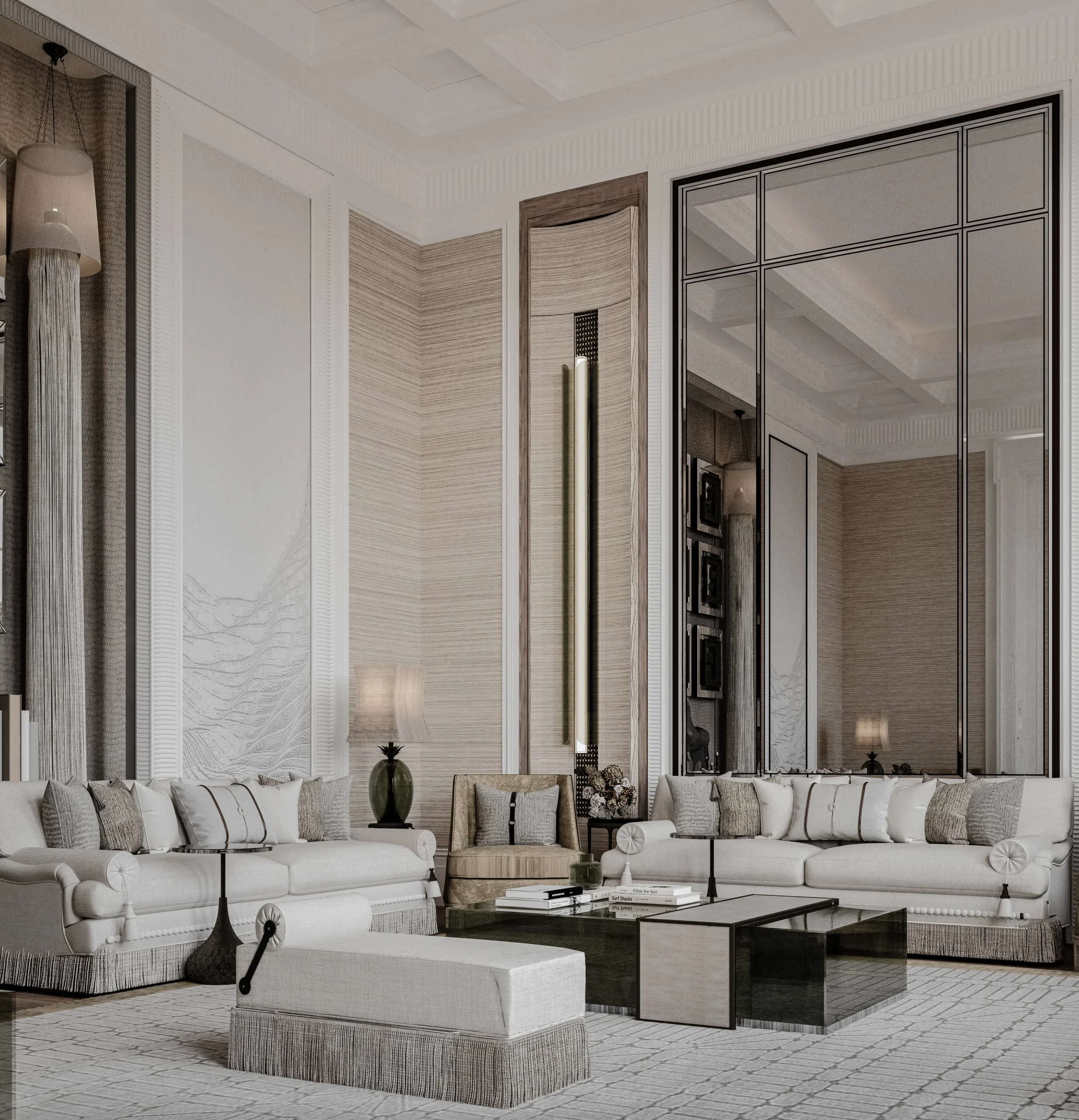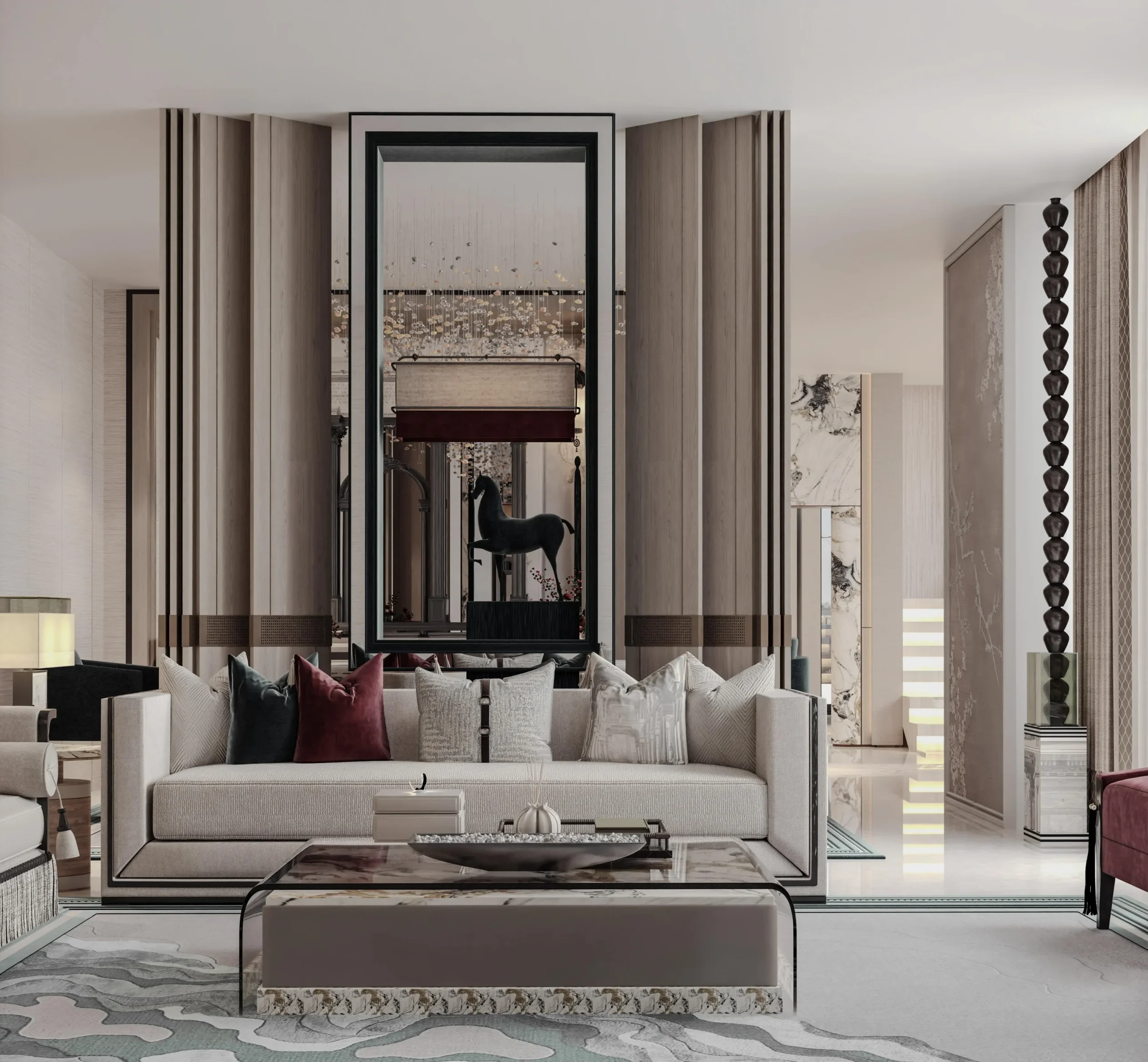 تنسيق فاخر للأثاث والديكور يحقق انسجامًا بصريًا متكاملًا مع التصميم العام.
