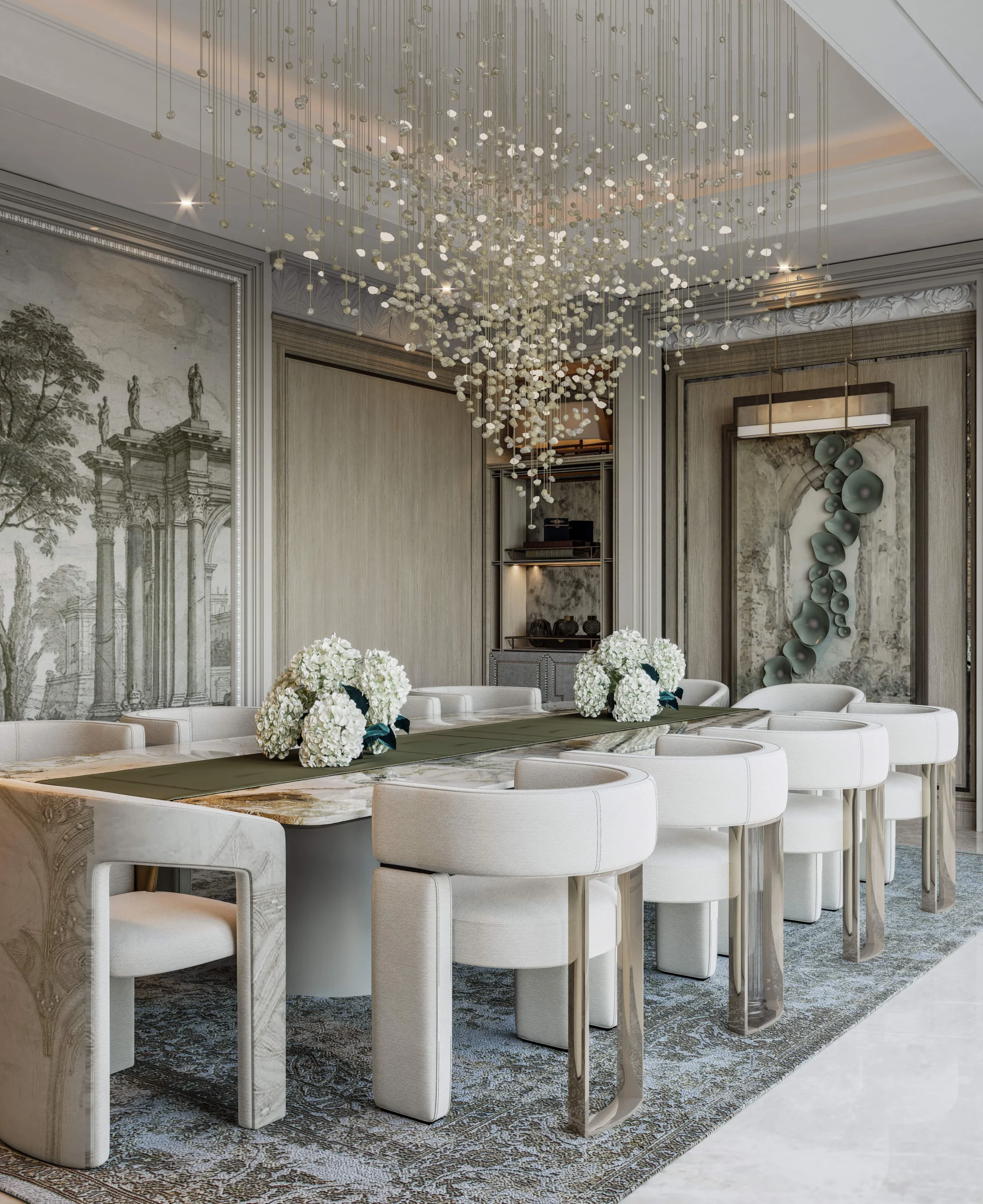 مساحة تجمع العائلة بروح من الدفء والانسجام، بتصميم متوازن بين الإضاءة الهادئة والخامات الراقية التي تعزز من تجربة تناول الطعام.