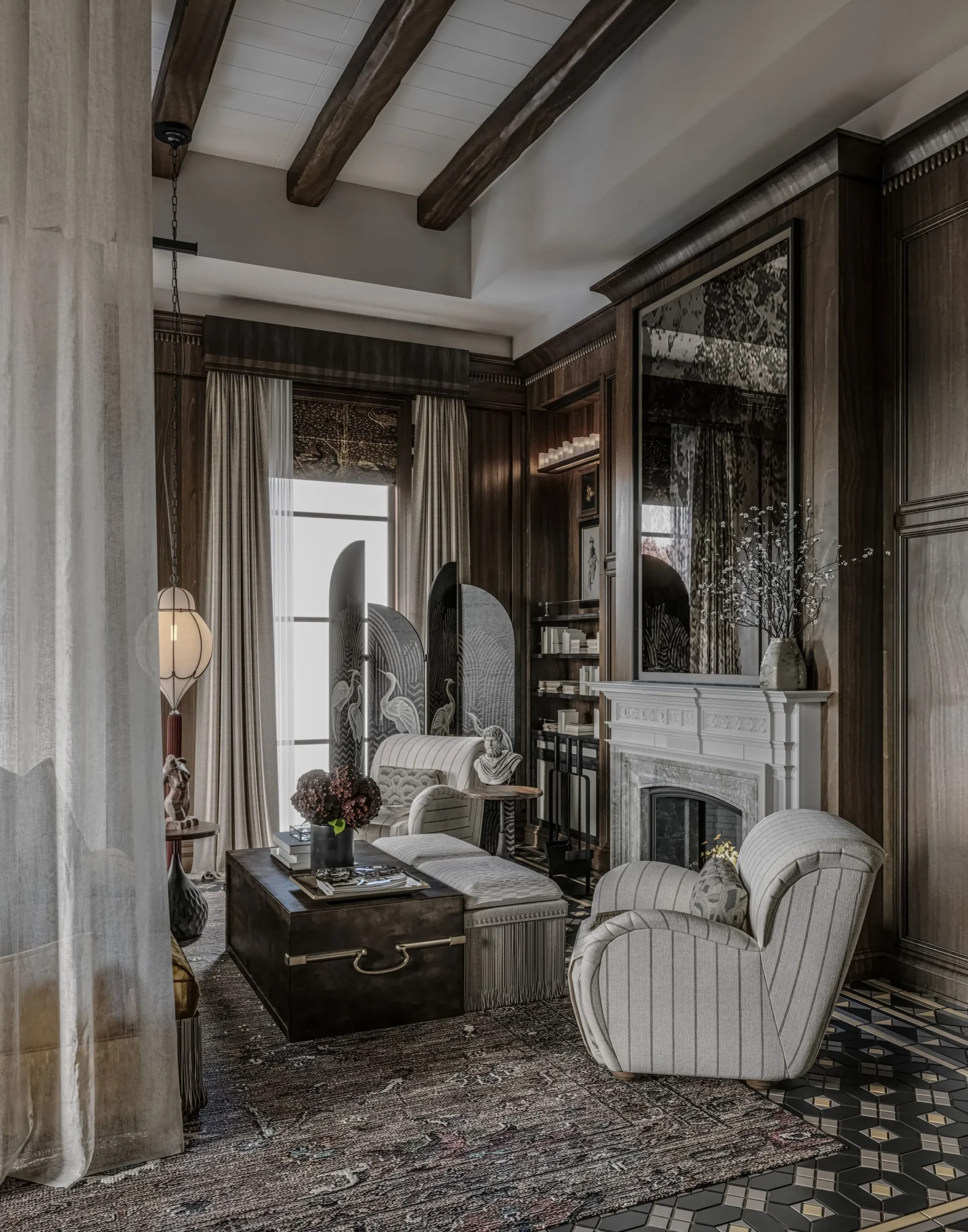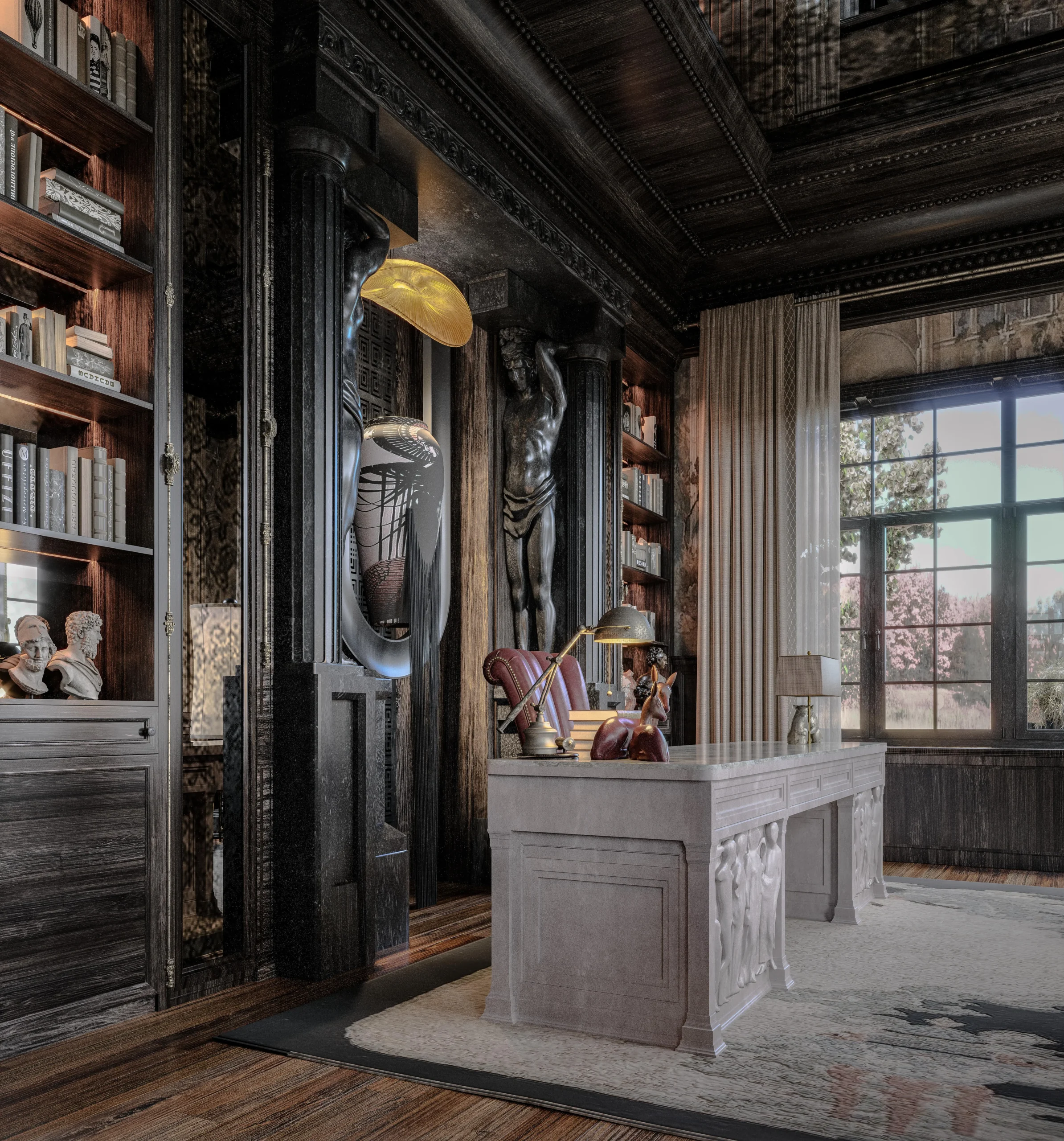 تصميم مستوحى من الطابع الكلاسيكي الفخم، يجمع بين الخشب الطبيعي والإضاءة الهادئة ليعكس هيبة واحترافية في بيئة العمل.