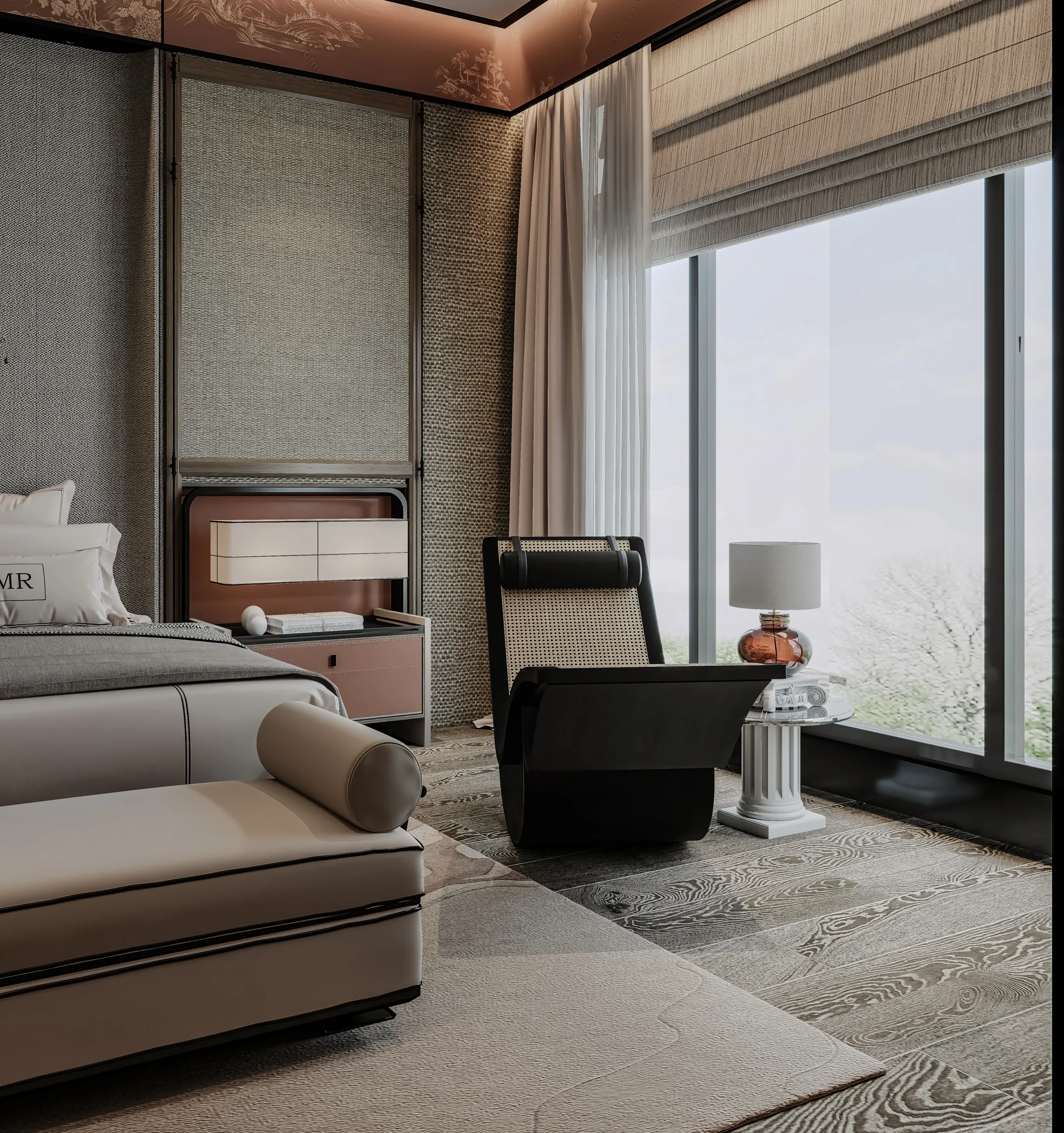 غرفة نوم عصرية تجمع البساطة بالراحة، بألوان هادئة وخطوط تصميم نظيفة تخلق أجواء مثالية للاسترخاء والهدوء.